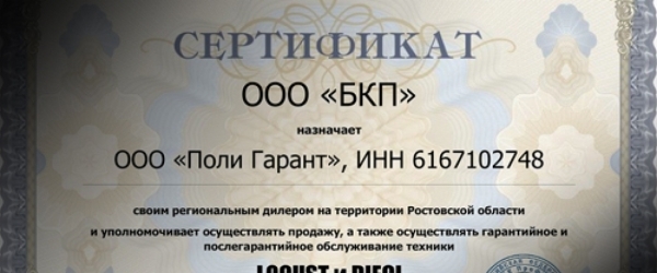 Уважаемые посетители сайта, клиенты и партнеры! Мы рады сообщить о получении сертификата регионального дилера LOCUST и DIECI на территории Ростовской области